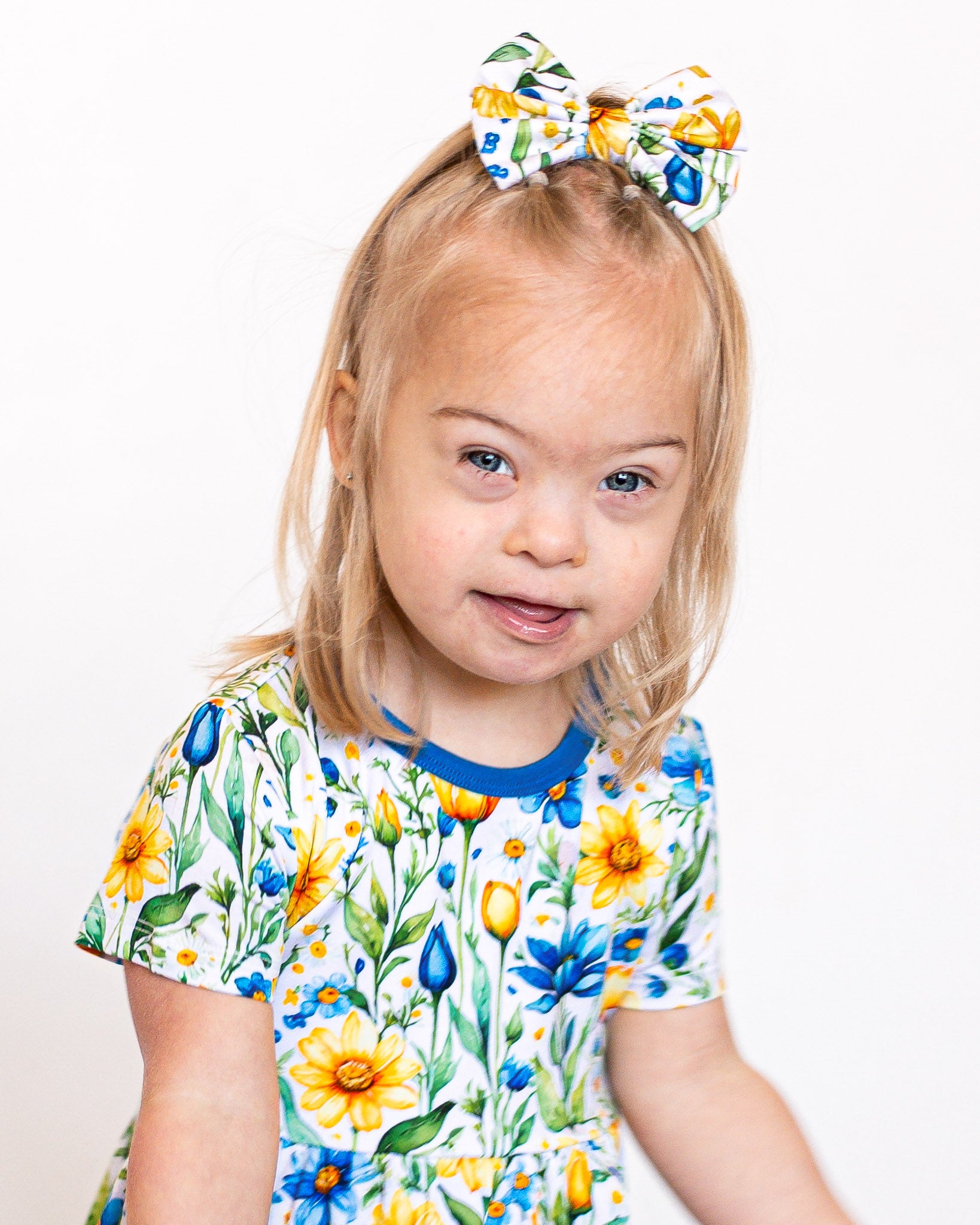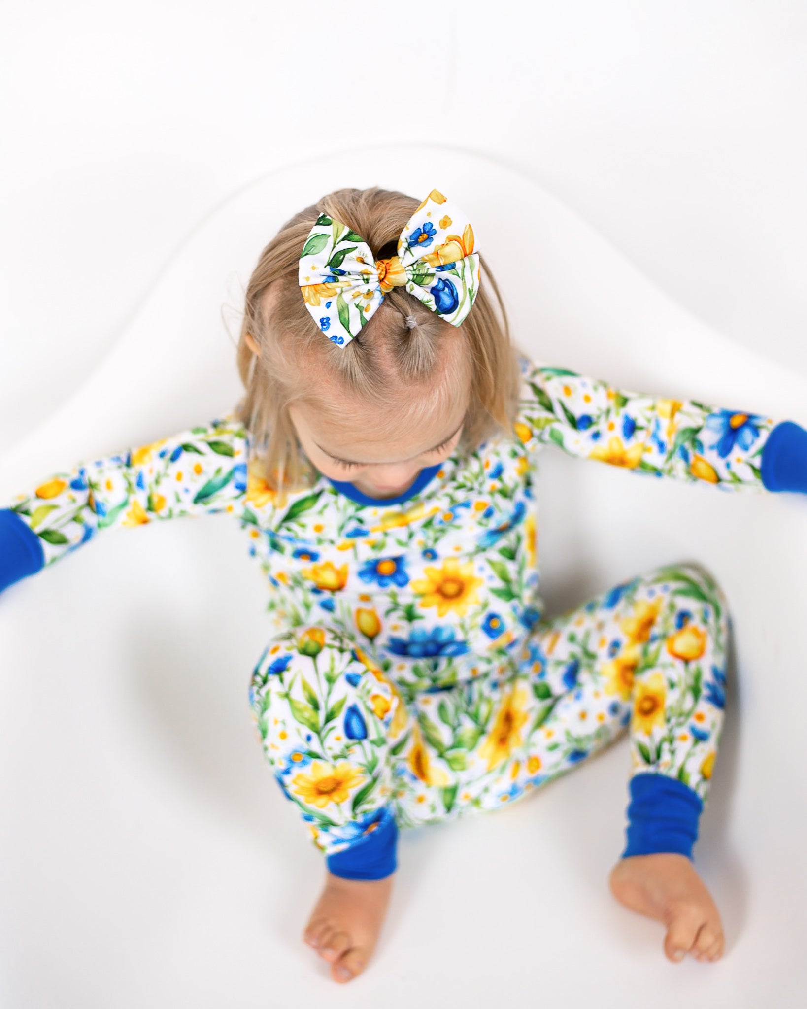 The perfect little finishing touch. Our Sunshine Meadows small clip bow features a bright blue and yellow floral print designed to coordinate with the Sunshine Meadows collection.