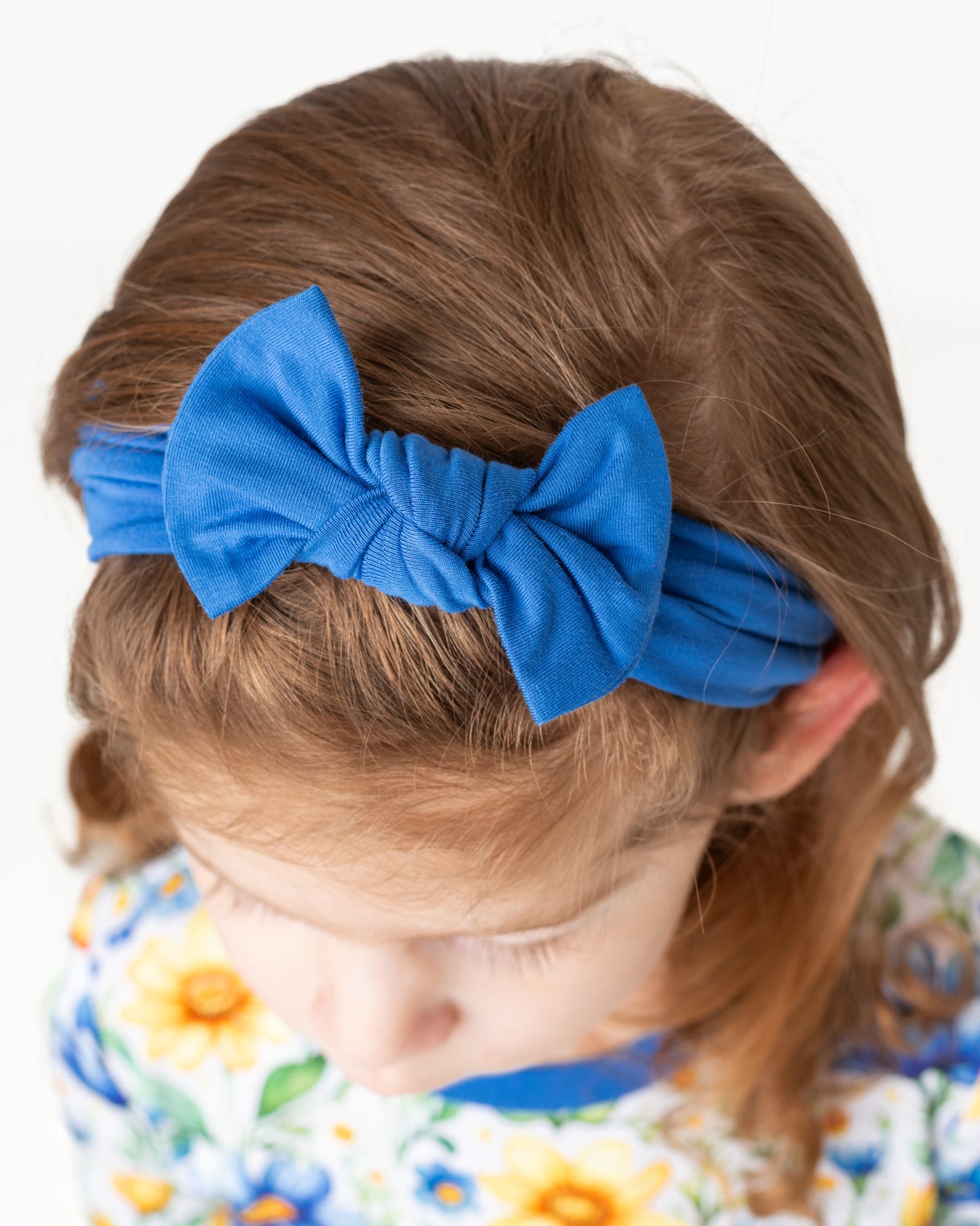 A simple everyday accessory. Our Bluebird headband bow features a soft solid blue color designed to coordinate with the Sunshine Meadows collection.